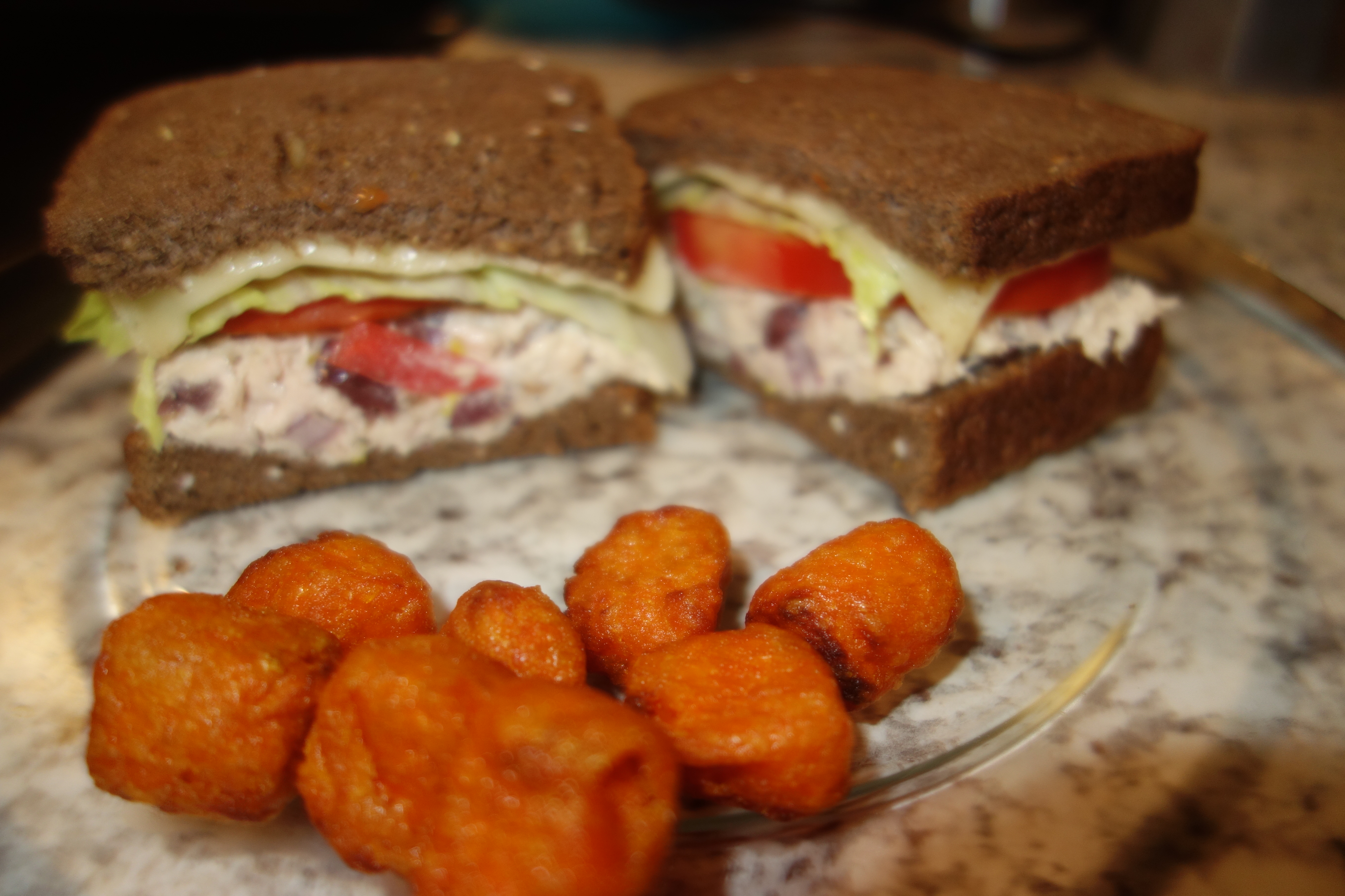 I have had a tuna melt on my mind for a while. After 2 days of 10 hour days I decided to coast. Tuna melt and sweet potato tots in the air fryer.