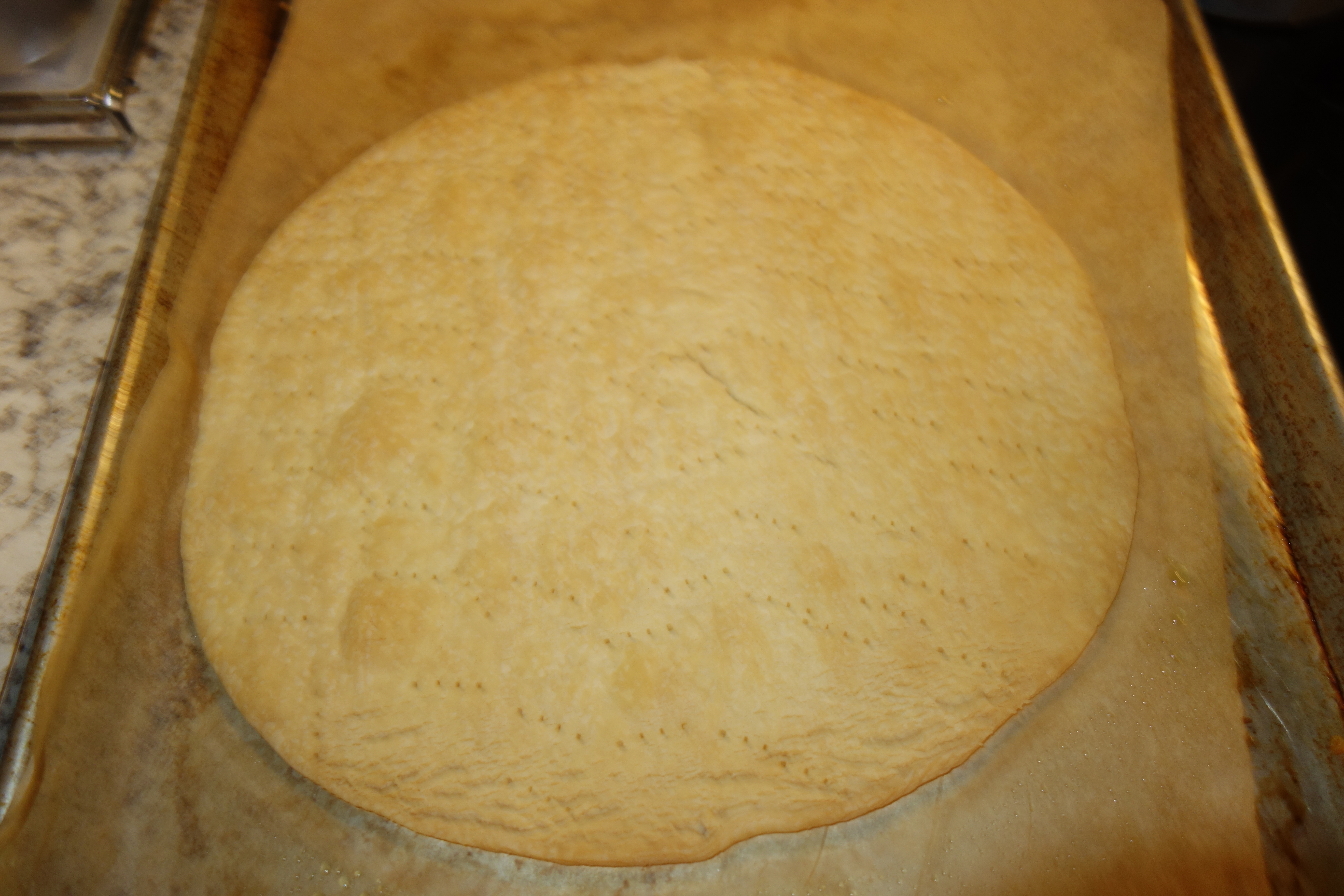 Put the pie crust on a baking sheet lined with parchment paper and dock with a fork. Brush with melted butter or spray with cooking spray and bake until brown.