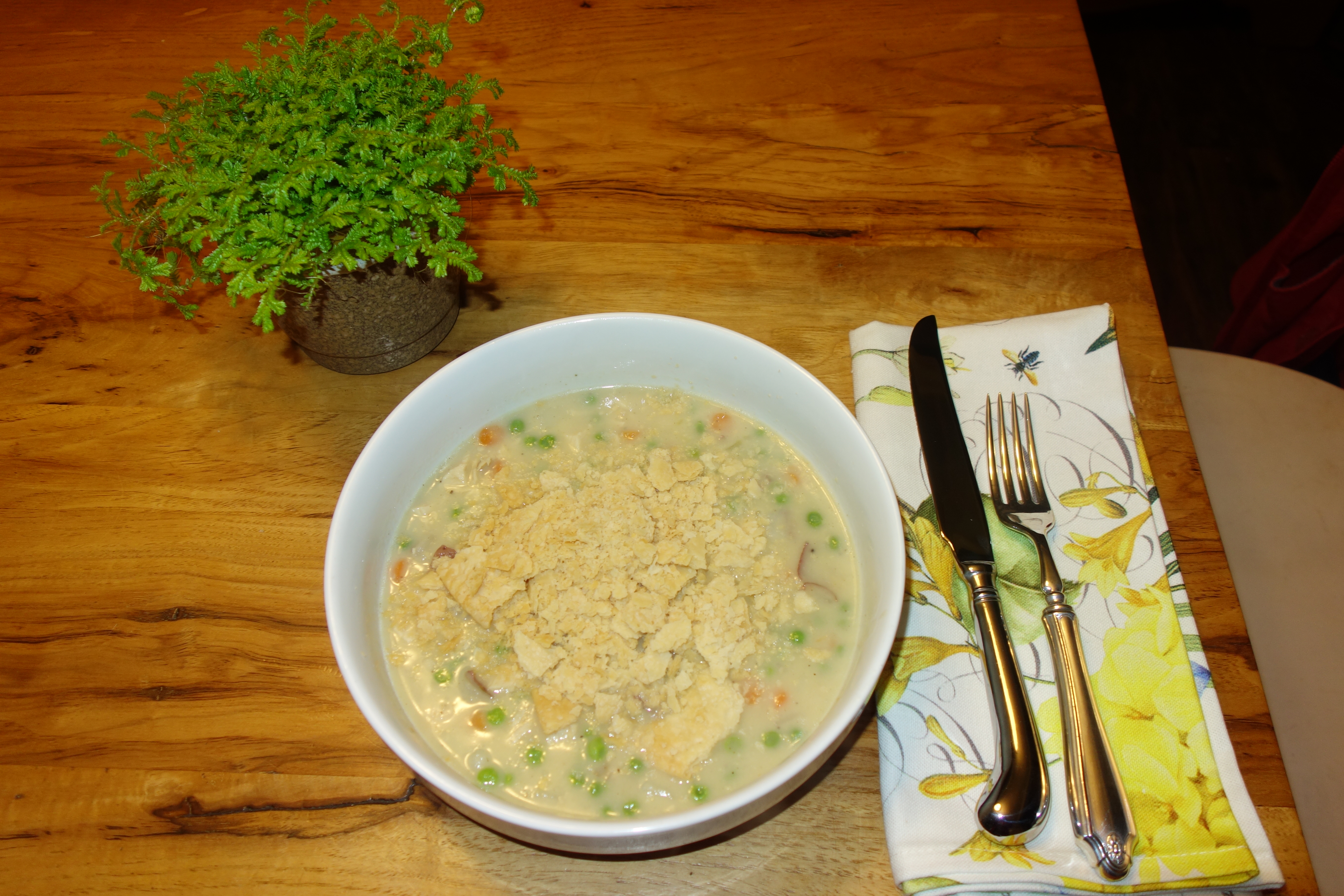 Add butter and oil to your stock pot. When butter is melted add in your vegetables and saute until tender. Add the poultry seasoning and stir 30 seconds add in flour and cook for 1 minute. Whisk in stock. When the soup is slightly thickened add the chicken and potatoes. Simmer for 20 minutes. Add in peas and cream and simmer 5 minutes. I top mine with a splash of sherry. Put your soup in a bowl and crumble pieces of the crust on the top.