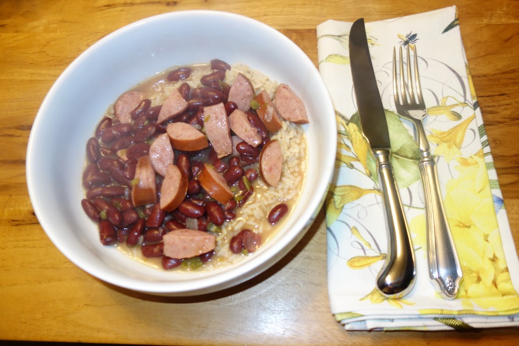 1 pkg of smoked sausage, I use an uncured, cut down the middle and diced