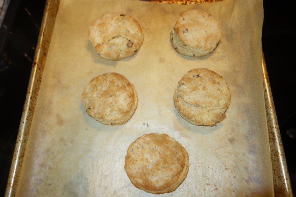 I prove time and time again I am not a baker. These biscuits were ok, not good or great. I decided to bake scrambled eggs on a baking sheet. That went well. I took a 1/4 sheet tray and sprayed it with cooking spray, covered it with parchment that went up all the sides and sprayed it again. I scrambled together 8 eggs, 1/4 cup of cream and some salt and pepper and baked until it was set. I used the biscuit cutter to cut out rounds to go on the biscuits for breakfast.