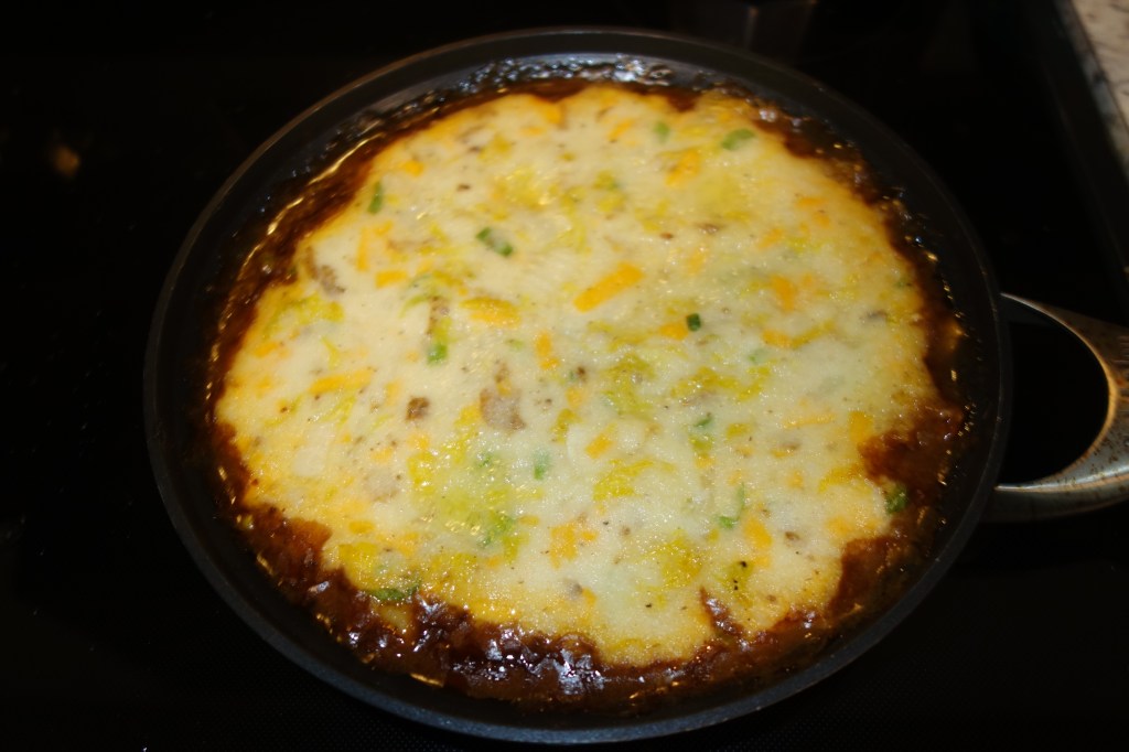 A first in my house! Store bought mashed potatoes. Simply Brand of course. I had left over hand pie filling in the freezer, which had cubed potatoes. I made a guinness gravy and added the pie filling. I took the store bought potatoes and added green onions,cheese, sour cream and some cabbage that I cooked in bacon fat. So fancy colcannon. Now we have double potato! I used my pastry silpat that has measures and spread the potatoes mixture out to fit the fan size and topped the filling. Brushed it with butter and baked. Ta-Da Shepherd’s Pie Oh My!!