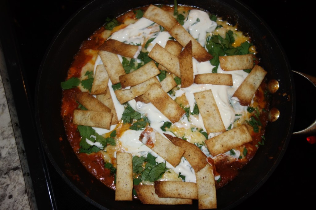 This recipe came from Deb Perelman’s The Smitten Kitchen Cookbook. I could not find this recipe on her blog. I did add a few things. I added cilantro, cumin and chipotle chili powder to the sauce before blending. I used flour tortillas.