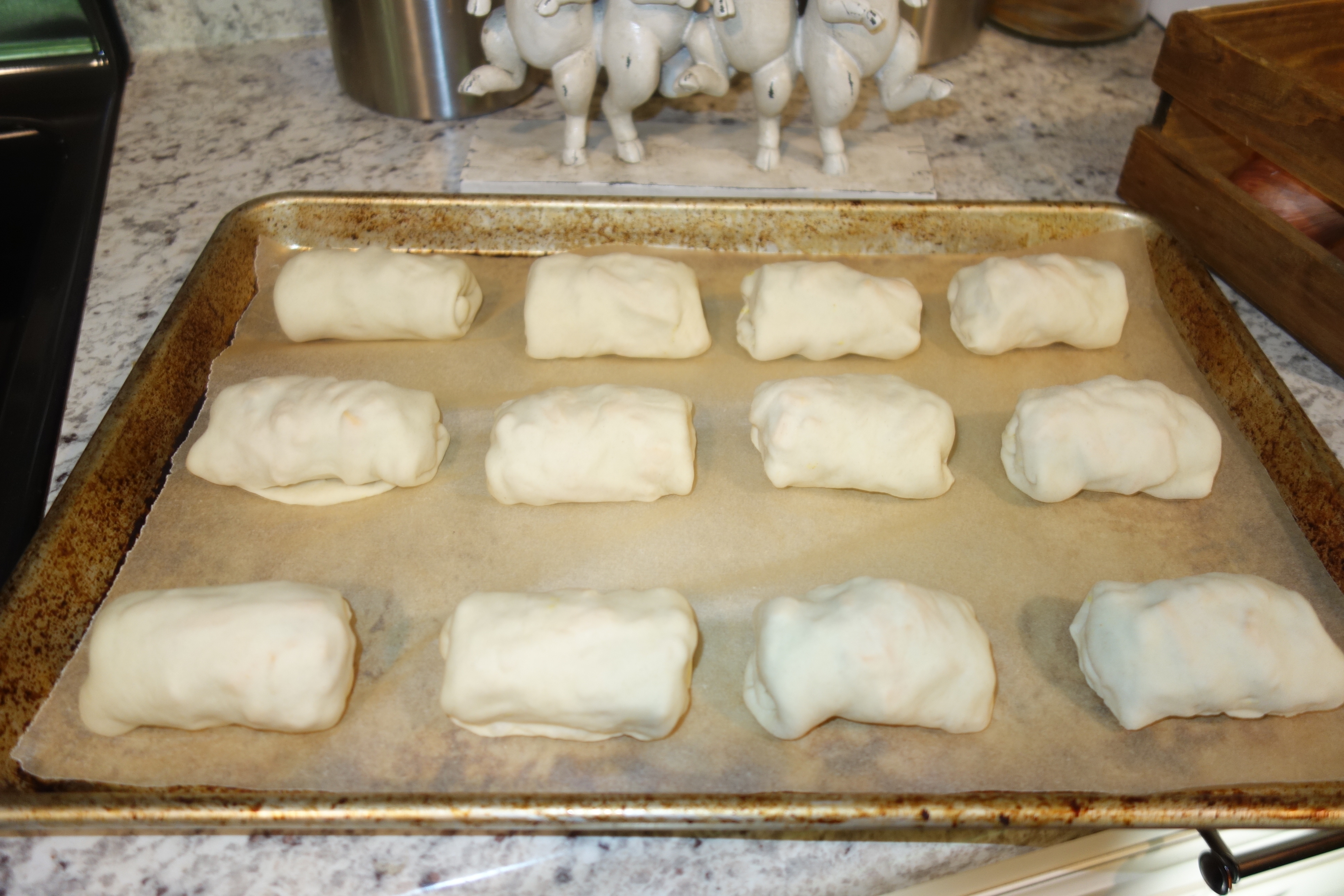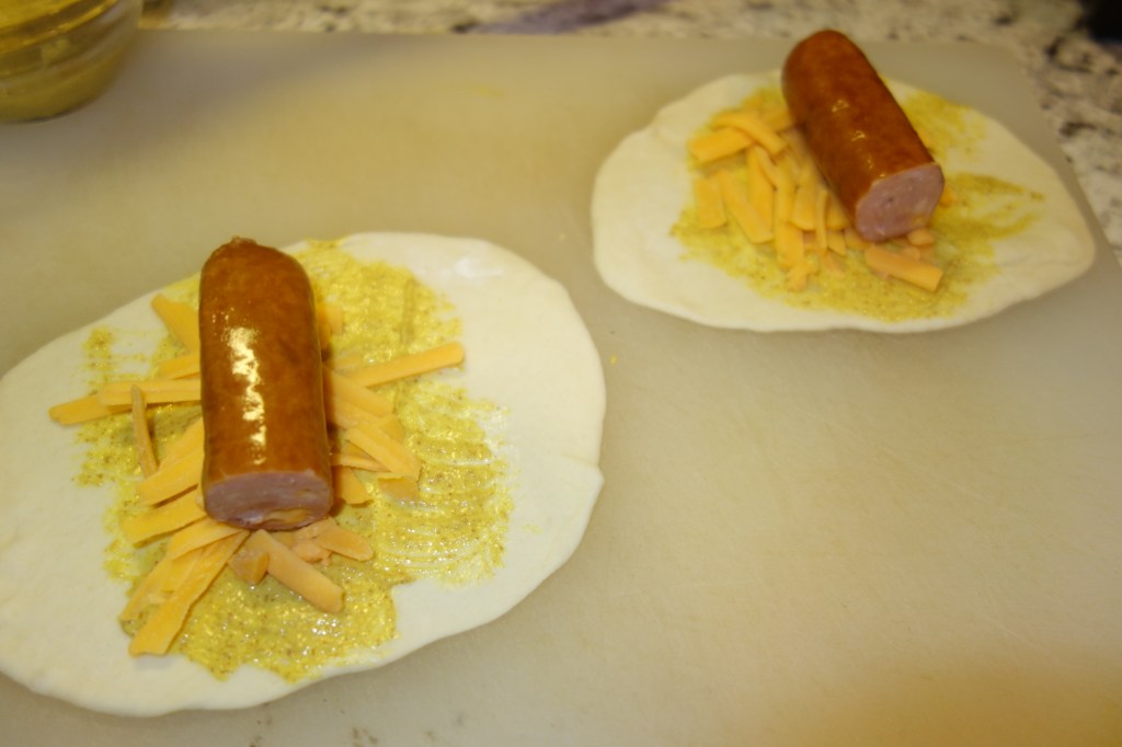 I used frozen dinner roll dough. I sprayed a muffin tin with cooking spray, covered it with plastic wrap and defrosted the rolls in the fridge for 12 hours. I rolled out each roll on a floured surface to about 4 inches. I brushed each roll with spicy brown mustard, sprinkled on some cheddar cheese and topped with 1/2 a jalapeno cheddar sausage. Rolled the side with the sausage end up and pressed down then rolled the other direction and crimped. Placed the rolls on a baking sheet lined with parchment and covered with a towel for 30 minutes to rise. Brush with melted butter. Bake at 375 for 14 minutes or until brown.