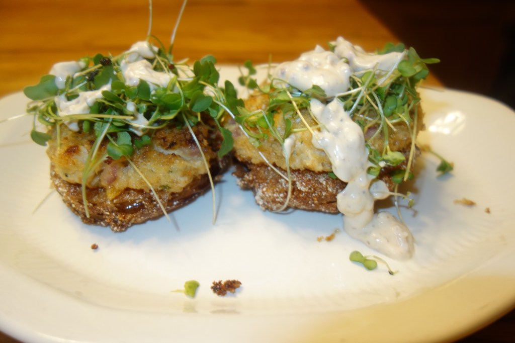 If you like fried green tomatoes this will leave you speechless! I coat them in flour and then in a mixture of buttermilk and hot sauce and then into a mixture of cornmeal, flour, and creole seasoning. Shallow fry in canola. I topped the tomato with a crab cake and topped that with micro greens and remoulade sauce. Well it’s obvious this is mostly southern girl and a bit sophisticated.