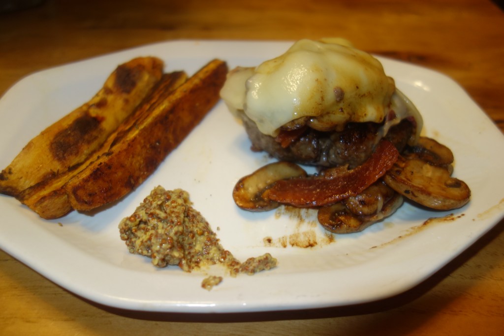 Bacon, Mushroom, Swiss Burger with Sweet Potato Wedges June 21, 2020 Sans the bun. With some grainy mustard. Share this: Click to share on Facebook (Opens in new window) Facebook Click to share on X (Opens in new window) X Click to share on Pinterest (Opens in new window) Pinterest Like Loading... Related