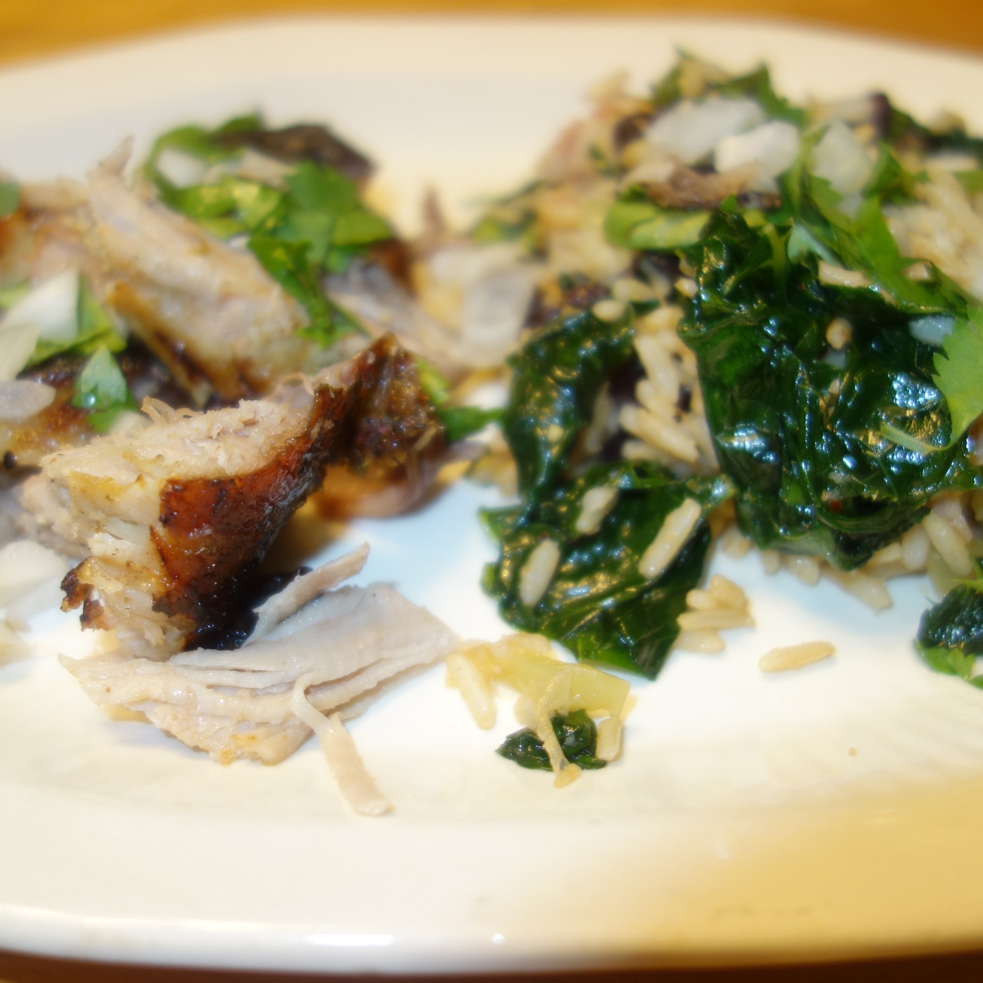 I can never thank one of my friends enough for having a crazy Puerto Rican potluck for her oldest daughters first birthday. I was so hooked on her mother’s pork roast! I have made this a few times and it is always a show stopper! You use a pork shoulder. Make deep slits with a knife and insert garlic cloves, season with adobo and layer on the sofrito. I cooked mine in a roasting pan skin side down and covered with foil on 350 for 1 1/2 hours. I turned it over and placed it on a baking rack uncovered and cooked it for 2 hours. I cranked the heat up to 450 and cooked 30 minutes until the skin was crisp. I make a Puerto Rican rice and beans but i use black beans instead of pigeon peas. I added some sauteed collard greens from my garden to the rice. Garish with cilantro, lime and pickled red onion. Today I used chopped white onion.