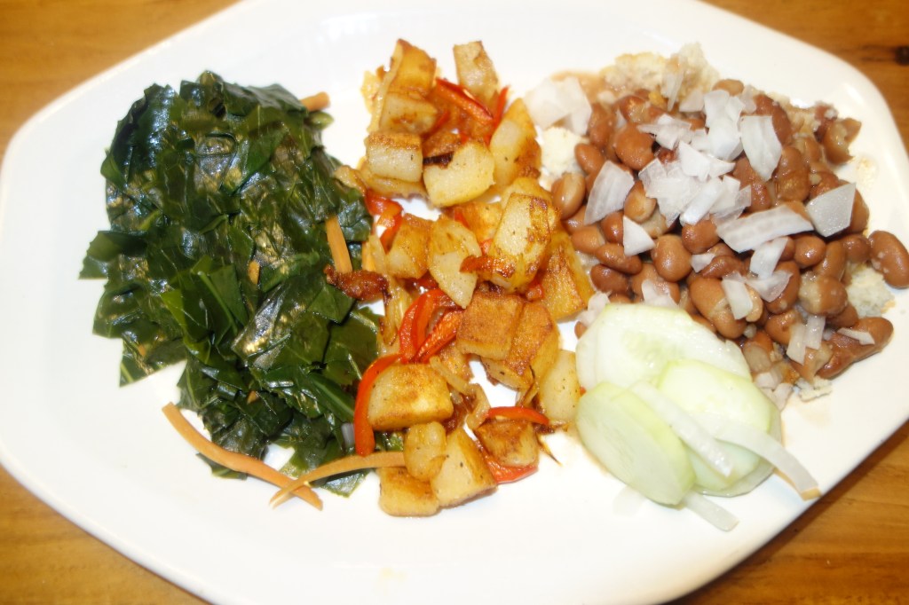 Collard greens purchased precut and washed in a bag, diced potatoes in a bag, store bought cornbread muffins and beans from a can.