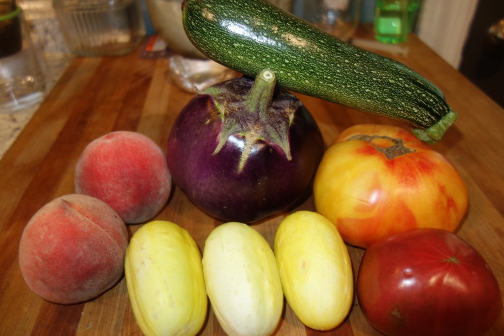 My local Saturday farmer’s market trip helped me with this weeks menu. I know have zucchini for a chip or a fry as a side for one of my sandwiches. I have heirloom tomatoes for my gazpacho. I see a peach dessert in my future. I have a yellow cucumber to add to my pickles and last but not least a beautiful eggplant for a sandwich.