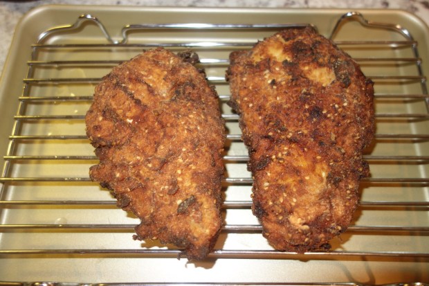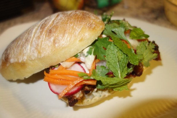Well my fried chicken did not turn out as spectacular as I wished. It was crispy and full of asian flavor. I pulled out the vacuum sealer and made a marinate of gochujang, soy and buttermilk and vacuum sealed the chicken in the marinate and left it all day. I came home and used the sealer to make my pickled veg. I put carrots, cucumber, radish and a hot banana pepper from our garden with equal parts sugar and rice wine vinegar in a bag and vacuum sealed it to pickle for an hour. I poured the marinate in a dish and whisked in an egg, I made a mixture of 1 cup of flour and 3 tbls of rice flour ( I cant use cornstarch but you should instead) with some ginger powder,sesame seeds, and salt and pepper. I left the chicken in the marinate mixture, then dredged it in the flour and shallow fried it in a 350 degree oil until golden brown. I toasted a ciabatta bun in the oven just until it was a little crisp on the outside. I scooped out a little of the inner side of the top bun. I made a cilantro mayo and put that on the bottom bun medium to heavy and lightly on the top bun. I sliced the fried chicken and put that on the bottom bun, added some pickled veg and topped that with a fresh herb mixture of cilantro, mint and basil.