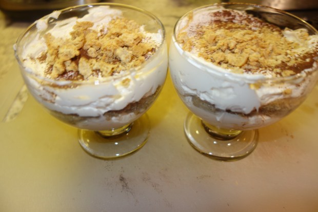 I had some of the soft lady fingers left from my raspberry tiramisu so I decided to use them. I mixed leftover coffee and some amaretto together and dipped the lady fingers in quickly, they soak up alot fast and fall apart. I started with the lady fingers and topped that with some marscapone mixed with amaretto and whipped topping and dusted that with cocoa powder and repeated the 2 steps and topped it with crushed amaretti cookies.