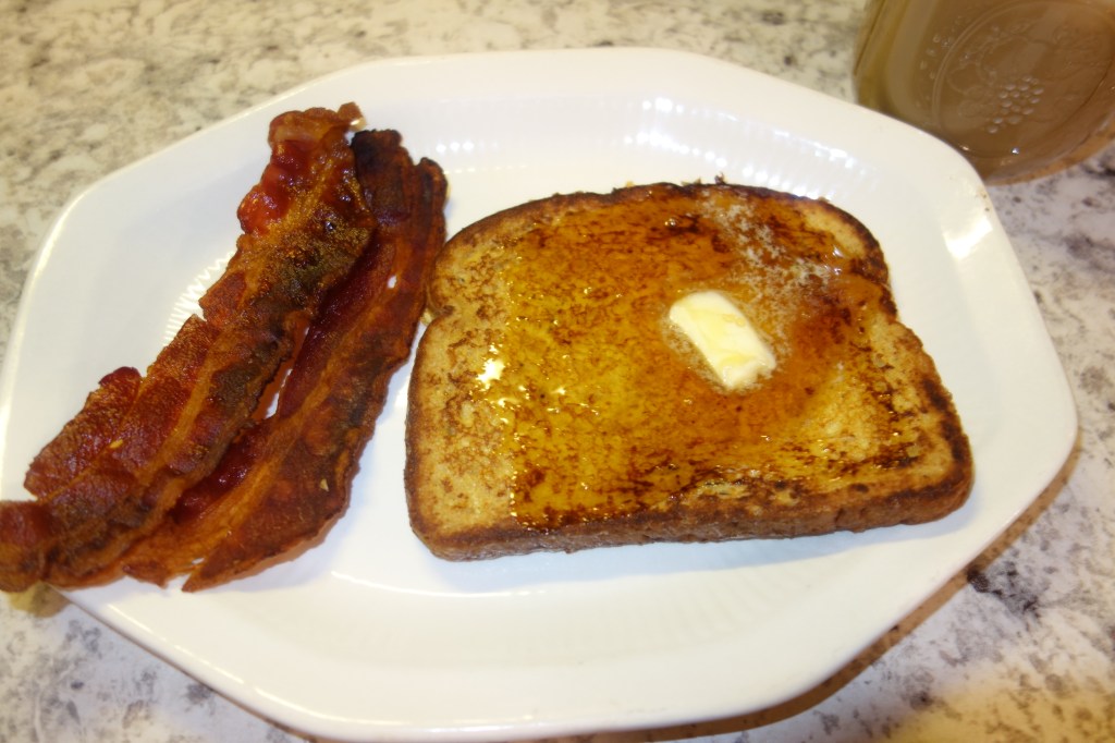 There is nothing really special about french toast. My sweetheart put in a special request for this mornings breakfast. He very seldom puts in a say about what we eat, so french toast it was. I do not like the white fried egg look or texture on my french toast. When I make my custard I only use the yolks, I add in heavy cream and half and half, cinnamon and vanilla paste. Today instead of just butter to fry the toast I added a little bacon grease. YUM!