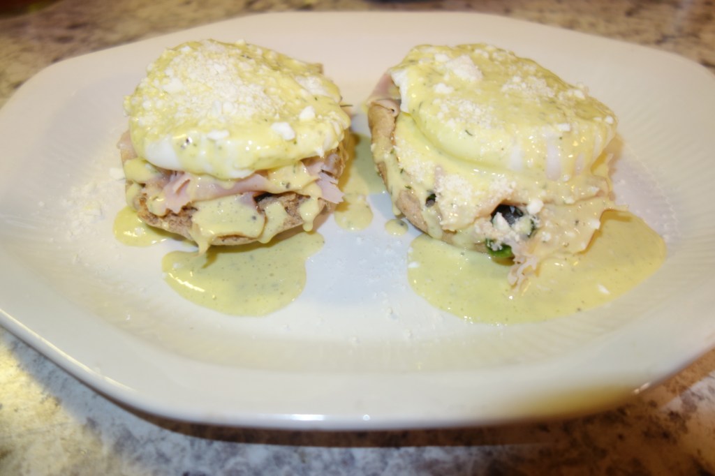 Sunday brunch on Monday morning! What a treat. I sauteed some spinach and poached my eggs in advance. I put all the ingredients for the hollandaise in the blender adding fresh dill to the recipe and just melted the butter. When we were ready to eat I reheated the water the eggs were cooked in and put them back in to get warm, I warmed the spinach and heated my ham in that same pan. I turned the butter up to get it to a bubble. I plated the muffins, topped with spinach, ham and the eggs. I turned on the blender and poured in the sizzling butter. Over top goes the hollindaise and at the bottom of my feta there is always some super fine stuff almost I sprinkled that over the top. YUM! https://www.foodnetwork.com/recipes/ina-garten/eggs-benedict-and-easy-hollandaise-sauce-3772150