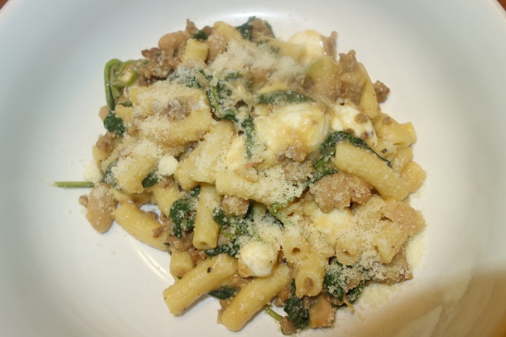 I bought some fresh frozen penne at my local farm store. I had no idea what to make and I thought about what I had in the freezer and pantry. I started by cooking a 1/2 lb of hot Italian sausage on low I added 1/4 of a diced red onion and cooked that until tender. I started the water to boil and added the salt and the pasta when it was boiling. I turned the heat to medium low on the sausage pan and added some fresh spinach until wilted and put in a can of rinsed cannellini beans. I saved 1 cup of the pasta water, drained the cooked pasta and put it back in the pasta pot. I added in some of the sausage mixture, some pasta water some mozzarella pearls and some parm and stirred to see what the consistence looked like added salt pepper and a splash of red wine vinegar. Lemon juice would have been optimum!