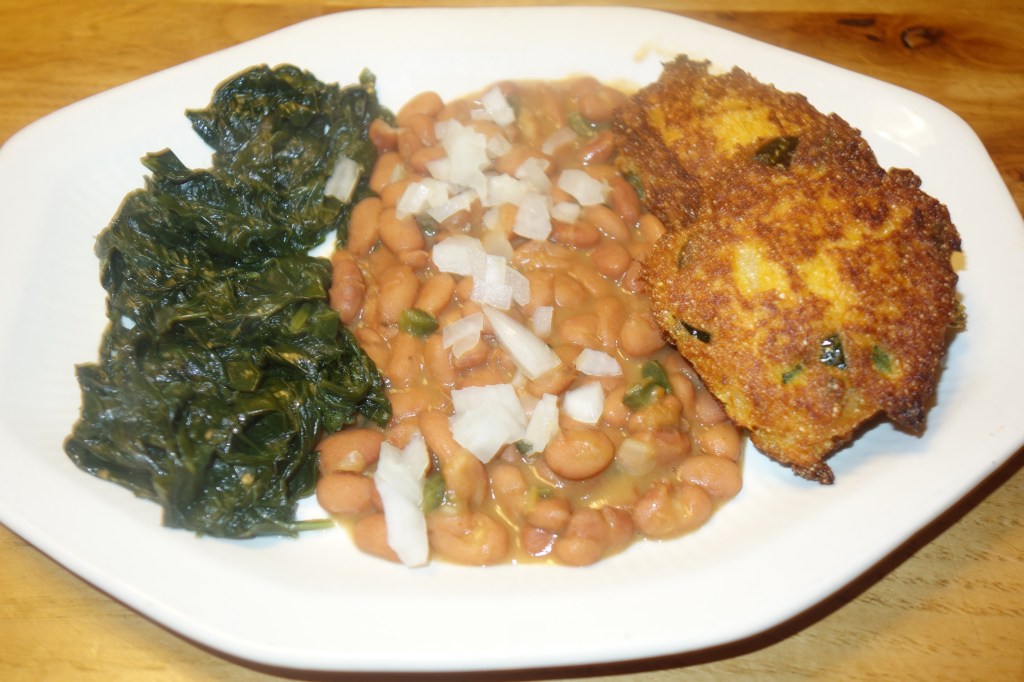 Taste so good, make you wanna slap yo mama! These fritters are amazing. The whole thing together wraps you in it’s arms for a big ole hug. A few weeks ago my theme was techniques. I blanched and froze some collard greens. I revived them tonight to go with this lovely meal. I can not explain how this meal touched my soul. Family, comfort and flavor. http://www.eatingwell.com/recipe/252656/sweet-potato-fritters-with-smoky-pinto-beans/