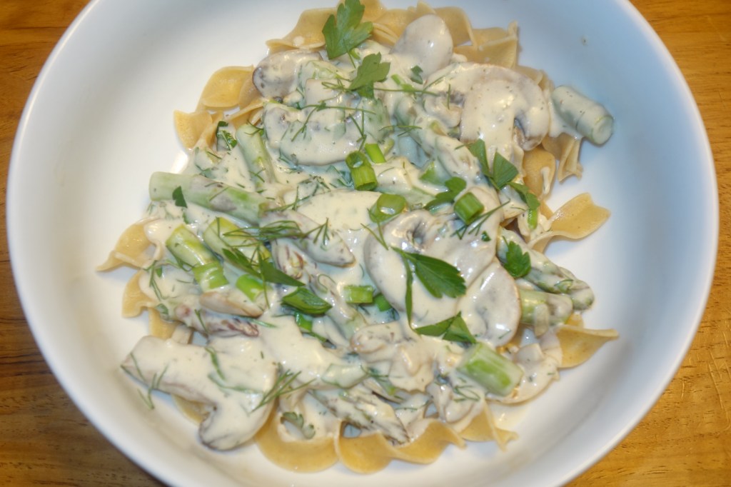 This is an easy and flavorful dish. This a recipe from an old cooking light magazine. I could not find it on their website but I did find a the recipe. I leave out the chicken and use the asparagus, I saute it into the mushroom mixture before making the sauce. https://www.food.com/recipe/creamy-chicken-and-mushrooms-cooking-light-17434