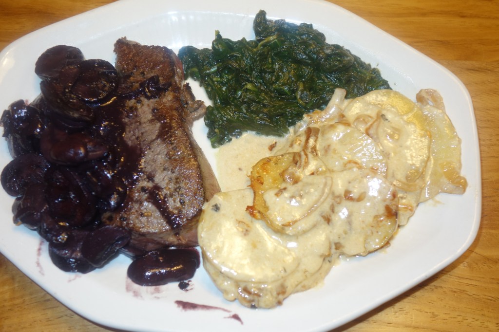 This is my comfort food. This is my go to steak meal. I leave out the bread. I like to cook my steak on the grill while everything else is cooking, if you follow the recipe the steak gets cold. I also use smoked gouda instead of gruyere in the potatoes and I cook it 1 hour or the potatoes don’t cook through. A little suateed spinach with butter and lemon on the side. https://www.foodnetwork.com/recipes/bobby-flay/tournedos-of-beef-mushroom-mustard-red-wine-sauce-caramelized-onion-potato-gratin-recipe-1938142