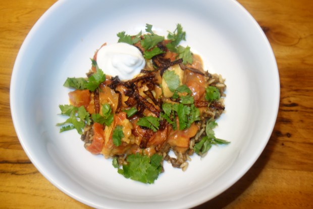 I crave Indian food! This Tikka is so good! I love mudjaddara. It is a meal by its self. But, the two together are an amazing combination. The spice, and fried onions, with the creamy tikka. Oh my! I so short cut the mujaddara. What ever you do, do not skip the fried onion step. I fried the onions in a canola olive oil blend. Stay with them, they go from slightly brown to dark in seconds. I sauteed the spices and some pre-cooked lentils( Amy’s in the produce section) in the oil from the onions. Then I added some microwaved basmati rice, stirred it together with half of the fried onions and covered it. I put some of the mujaddara in a bowl topped it with the tikka and garnished with the rest of the fried onions, cilantro and plain yogurt. http://www.eatingwell.com/recipe/250138/quick-chicken-tikka-masala/ https://www.americastestkitchen.com/recipes/8035-rice-and-lentils-with-crispy-onions-mujaddara/