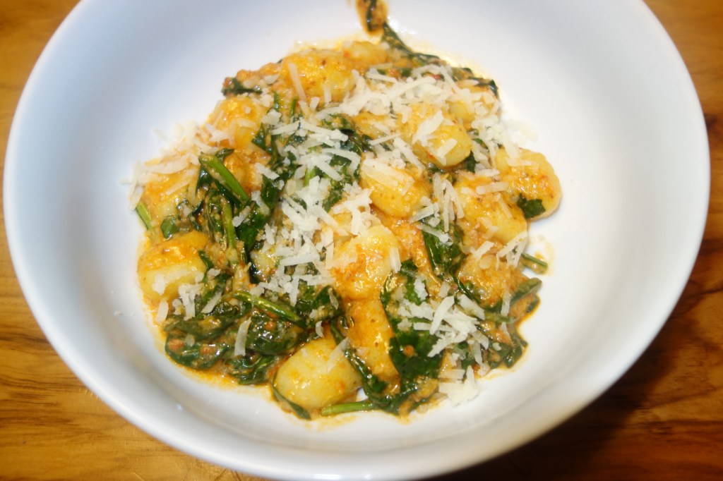 This is a Spanish influenced dish. A romesco with Gnocchi and manchego. So smoky. I used smoked paprika in place of the regular. I put the gnocchi, spinach and the sauce back into the pot that I cooked the gnocchi in and cooked it on low until the spinach wilted then added the cheese. https://www.cookinglight.com/recipes/gnocchi-with-spinach-and-pepper-sauce
