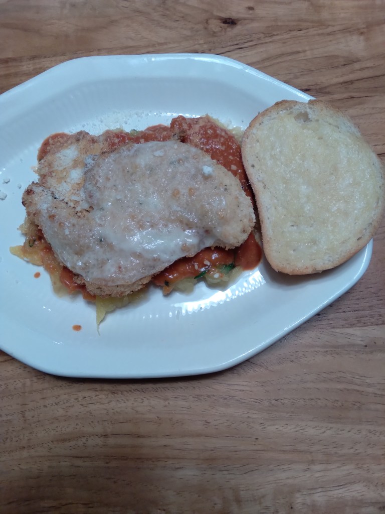 I love chicken parm! I try to pan fry it and the outside is done before the inside. I tried to pan fry and them put it in the oven and it gets soggy or sticks to the rack or pan. But now I know. Air frying is the key. I realized once I was home that I did not have an egg for my normal breading method, so I improvised. Flour, then into heavy cream, then into a mixture of panko, seasoned Italian bread crumbs and parmesan. Spray the air fryer and the chicken with cooking spray. I cooked each breast for 6 minutes then turned it over and cooked another 6 minutes. I put them on a sheet tray lined with foil and topped with a baking rack sprayed with cooking spray. Into the oven at 400 for 5 minutes, top with cheese and put back in for 5 more. I roasted the spaghetti squash at 400 for 45 minutes. Scraped the squash into a colander and pressed out the liquid. I put the squash in a bowl and seasoned with salt, pepper, olive oil, parm and fresh basil.