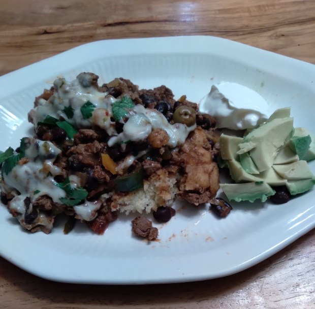 I don’t make this often. My sweetheart is allergic to corn, so the cornbread makes him have a mild reaction. I saw a recipe which is the reverse of how I normally make it and thought that I would try it. The good stuff is on the top instead of under the layer of cornbread.