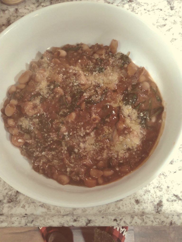 Heat the oil in a Dutch oven over medium heat. Add the sausage and cook until browned. Add in the onion and carrots, saute until tender. Add garlic and rosemary saute 1 minute. Add the tomato paste and cook for 1 minute. Pour in the wine scraping up the brown bits from the bottom of the pan. Add the beans and enough stock to just cover. Bring it to a boil and reduce to a simmer. Cook until reduced and thickened. About 30 minutes . Stir in your greens and cook 10 minutes longer. I garnished with parmesan and smoked olive oil.