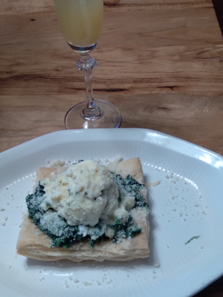 A baked puff pastry square topped with creamed spinach and fancy scrambled eggs. I added sour cream, chives and fresh dill to the eggs. Garnished with parmesan. And a nice bellini to wash it down.