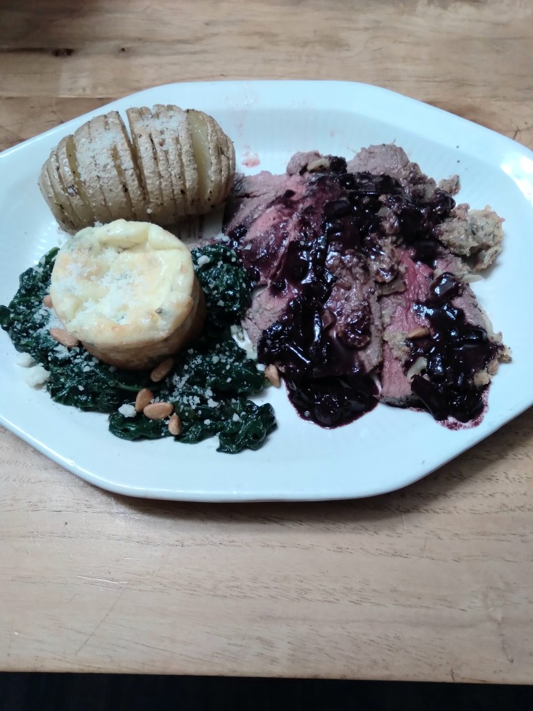 Mustard coated roasted filet of beef with red wine sauce, hasselback potatoes, Sauteed spinach with parmesan and pine nuts and mini savory cheesecakes. https://www.kqed.org/w/morefastfoodmyway/episode216.html