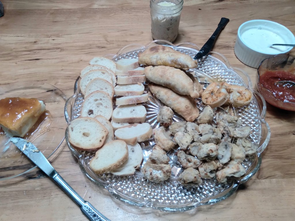 Santa brought a new air fryer a day early. Empanadas and mushrooms were air fried. When I make picadillo there is always extra. This time I froze it. Defrosted picadillo and I used a store bought pie crust and made my empanadas. A ziploc bag with flour, salt and lemon pepper breaded my mushrooms. A little brie with some major grey’s chutney over the top on a crispy little toast. Rounded off with an oven roasted shrimp with a spicy cocktail sauce.