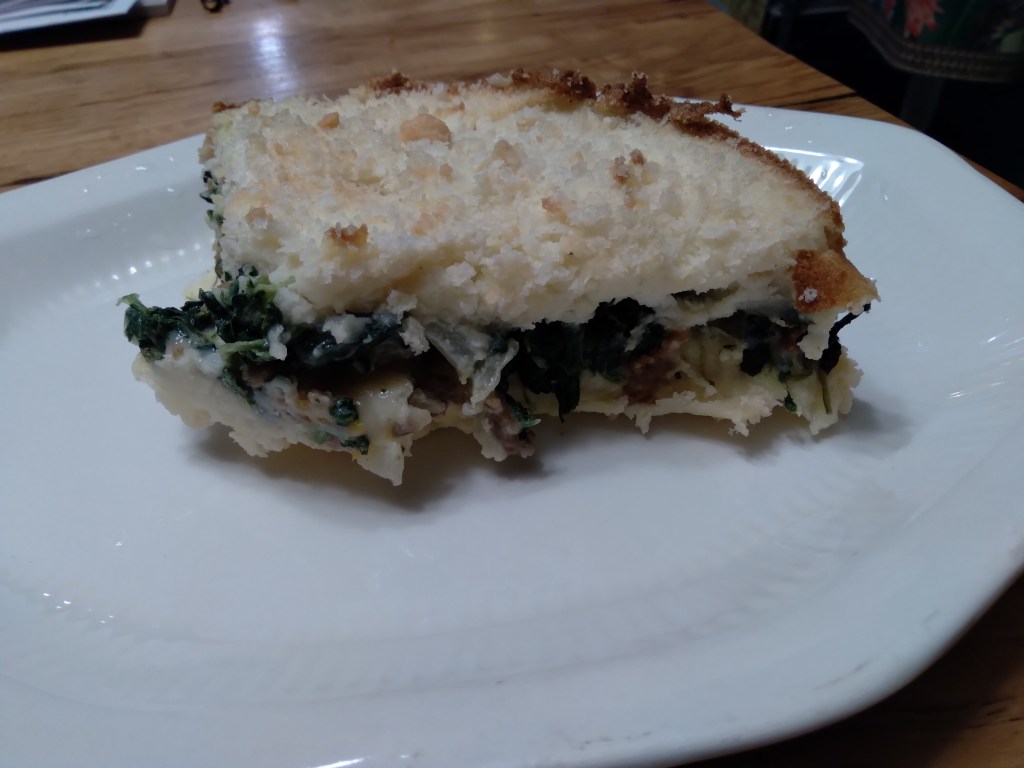 This turned out better this time. It tasted good, but it didn’t hold together when I cut it last time. I as always tweaked the recipe. I used Simply brand pre-made mashed potatoes, I added the eggs and some parmesan. I sauteed some cooked and drained chopped frozen spinach with some onion then added parmesan and a little cream. The filling is hot Italian sausage and the spinach. Potato Pie, Italian Style – Magazine – FineCooking