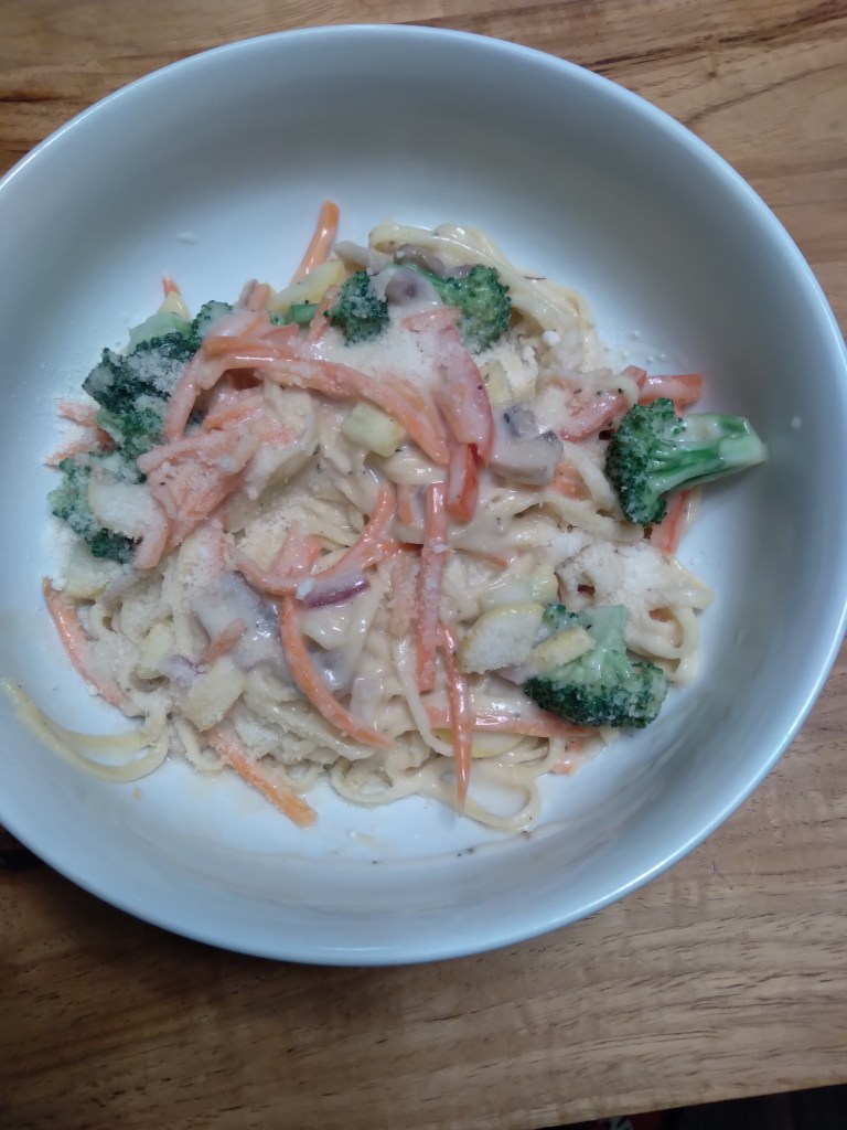 Short cut primavera. I used fresh store bought pasta and store bought refrigerated alfredo. I sauteed some fresh vegetable, added lemon zest and juice to the alfredo. And ta da creamy, lemony, pasta primavera.