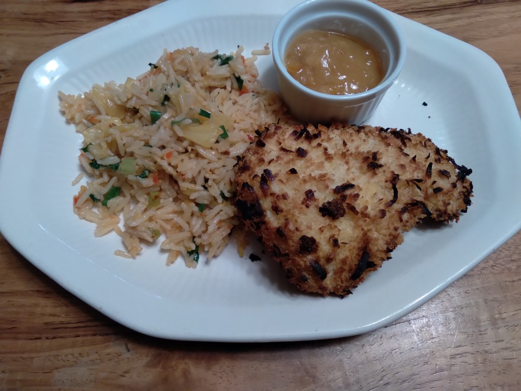 These are so complimentary spicy rice with sweet chicken. I did a traditional breading method, flour, then egg and into a mixture of panko and coconut. I sprayed them with cooking spray and air fried them. I made a dipping sauce of marmalade, gran marnier, dijon, and horseradish. And finally a pineapple fried rice. Pineapple Fried Rice Recipe | MyRecipes