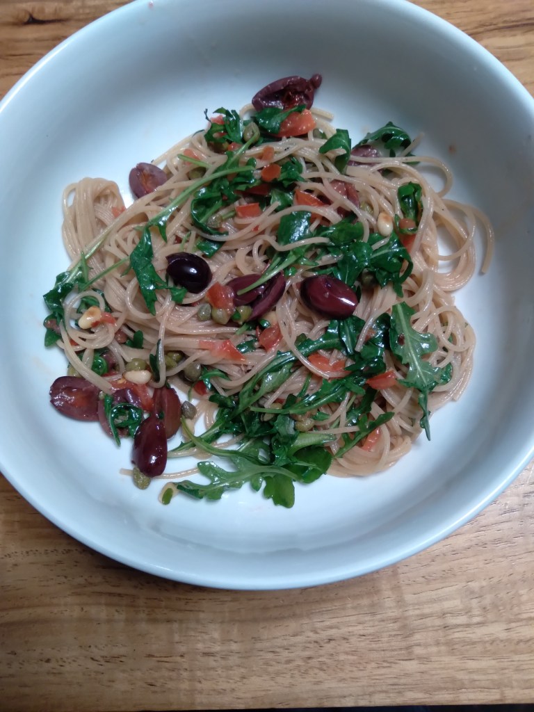 My sweetheart loves clean light feeling meals. Yes this is pasta, but the sauce is made of all uncooked ingredients that make it feel fresh and light. I love these mediterranean flavors I needed a little something, so I added some toasted pine nuts. I also used a little of the pasta water for moisture instead of a lot more olive oil. Spaghetti with Tomatoes, Arugula, Capers, and Olives Recipe | Bon Appétit (bonappetit.com)
