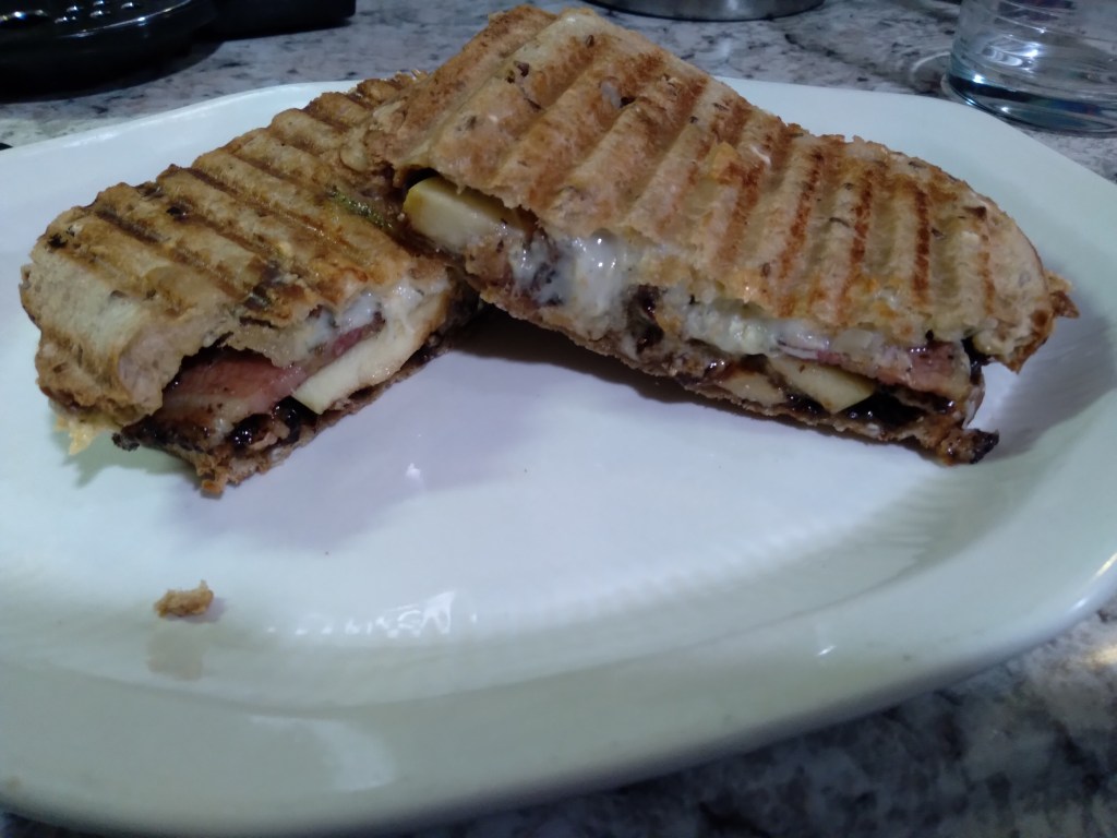 Oh My!! This hits all of notes for me. 7 grain bread, fig jam on one side topped with smoked blue cheese, sliced green apple, black pepper bacon, gouda with honey and clover and dijon. This is something special!