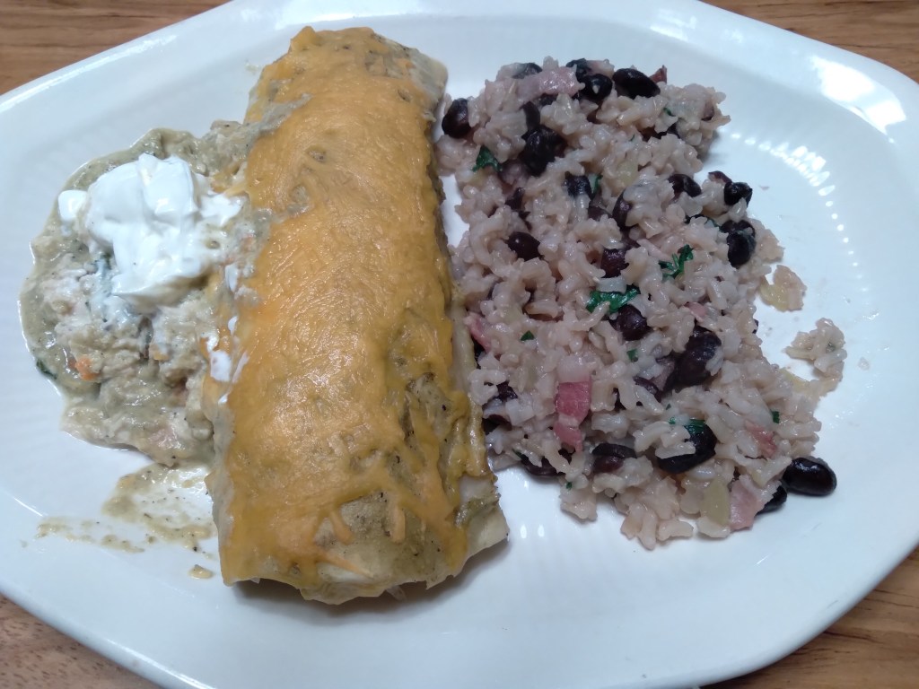 For the rice I start with a chopped up piece of bacon and render some fat. I don’t crisp it I just cook it until it just starts to brown, in goes some diced onion and poblano pepper, saute until the onion is tender add in 1 cup of quick cooking brown rice and 1 tsp of cumin and toast 1 minute, add in 1/3 cup of cooked black beans(in Puerto Rico these would be pigeon peas) and 1 3/4 cup of stock. Bring to a boil, cover and reduce to a simmer for 20 minutes or until all of the liquid has been absorbed. Finish the rice with chopped cilantro and a lime juice.