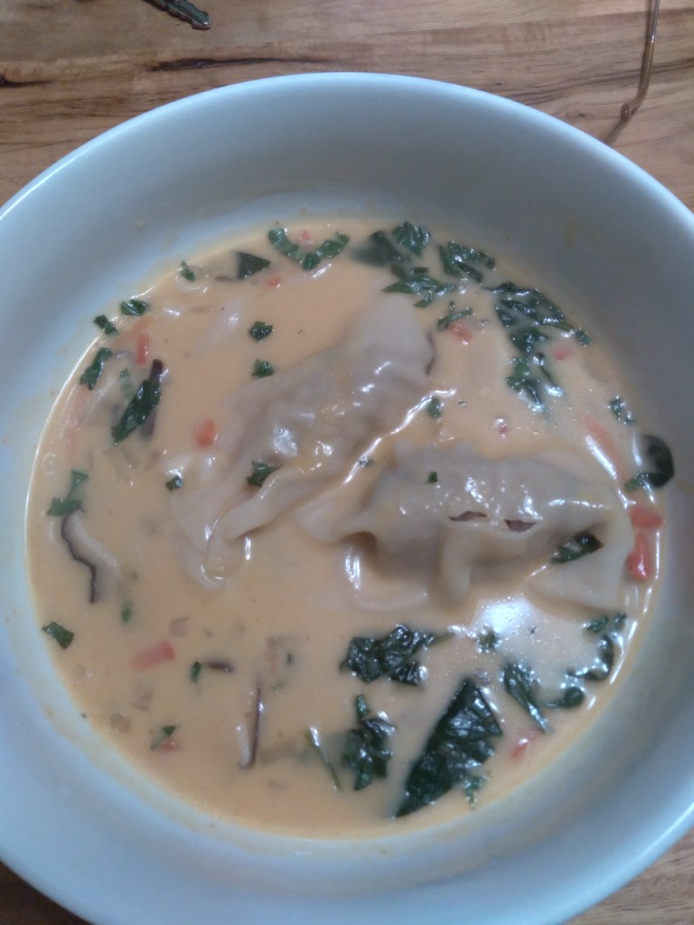 I needed a soup for this week and I kept thinking curry. I looked at a few different recipes and came up with my own. It has all the notes of a Thai coconut soup but with shrimp and pork dumplings from my freezer. I would make this again and use store bought frozen dumplings or a few noodles.