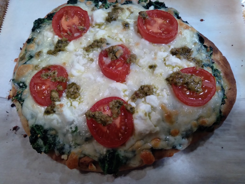 The last time that I made this I used a large naan pizza crust. This time I used 2 roasted garlic naan breads and I double the spinach part of the recipe. The tomato was a nice addition to add a fresh pop to cut through all the creamy cheesy goodness. https://peasandcrayons.com/2015/03/three-cheese-pesto-spinach-flatbread-pizza.html
