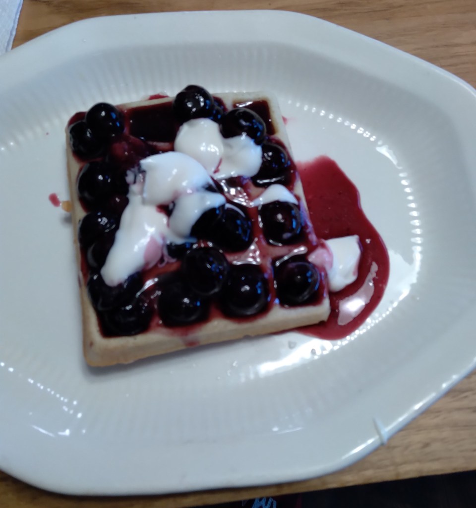 I have never made waffles. I did not plan for our Sunday breakfast as I usually do. I found that I had 1 egg and no bacon. I did find some fresh blueberries. I had some bisquick, I have a waffle maker that I bought to make hashbrown waffles. Ta Da, waffles with blueberry sauce