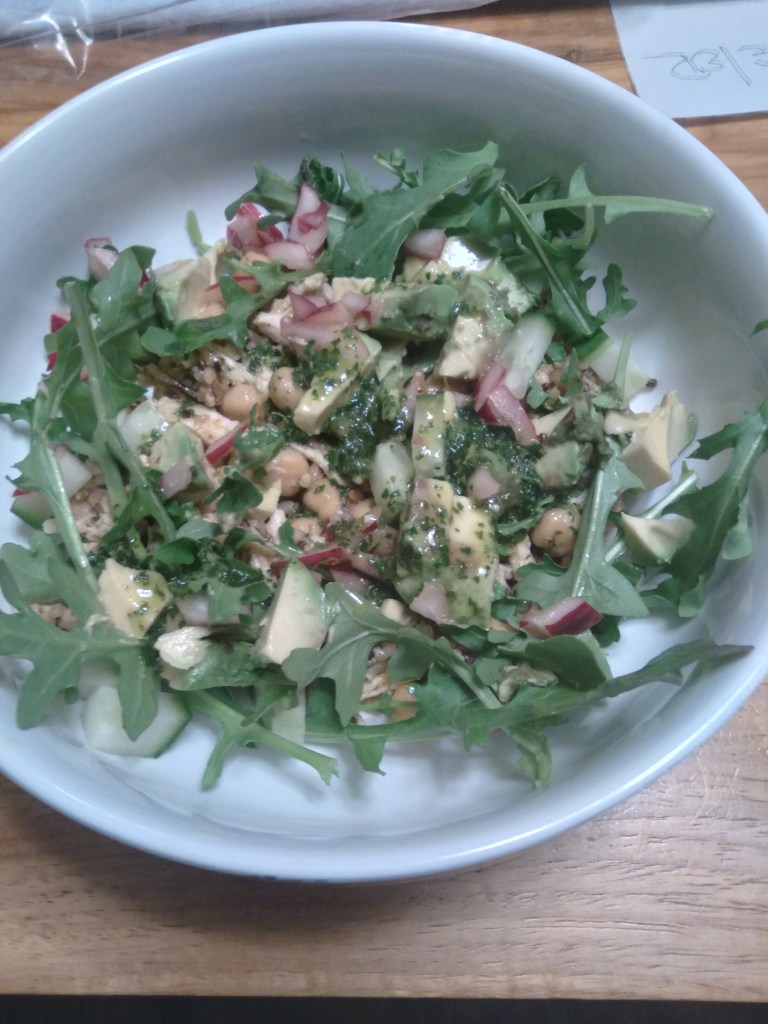 This dish was so fresh and the spice was just right. I made it less of a salad than the recipe calls for. I used a microwave 7 grain rice blend. I heated some olive oil in a skillet and added the chickpeas, chicken, cumin, and a pinch of cinnamon and cooked until everything was heated through. I added in the rice and some zatar and cooked a minute or two then pour in some of the dressing and mixed it. I put the rice mixture in the bowl and topped with the rest of the ingredients. https://www.epicurious.com/recipes/food/views/grain-bowls-with-chicken-spiced-chickpeas-and-avocado