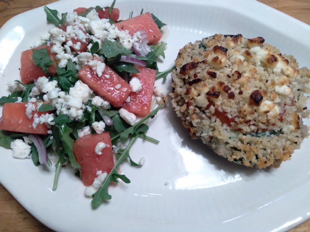 The combination of mint, watermelon and feta is phenomenal! The recipe comes from one of my go to cookbooks, Live to Eat: Cooking the Mediterranean Way by Chef Michael Psilakis. I checked it out from the library 4 or 5 times before I finally said to myself, I need to just buy this. I had some of the spinach and artichoke dip that I saved from my twice baked potatoes, so, I used it to stuff some portobello mushrooms. I topped the dip with a slice of tomato, I season the tomato with salt, pepper and oregano. I covered the mushroom with panko tossed in olive oil and added a little feta on top to tie it all together. Baked at 400 for 20 minutes. What a sensational meal.