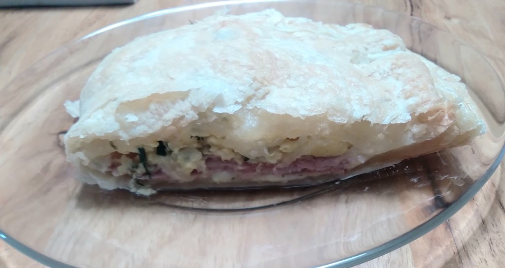 I make different versions of this a lot. I keep puff pastry in the freezer all the time. I usually brush the pastry with dijon and layer on ham and cheese, fold it over, crimp it shut and bake. Today I scrambled some eggs and in the end added in some chive cream cheese, fresh chives and fresh dill. We have dill havarti, ham and scrambled egg turnover. Yum!