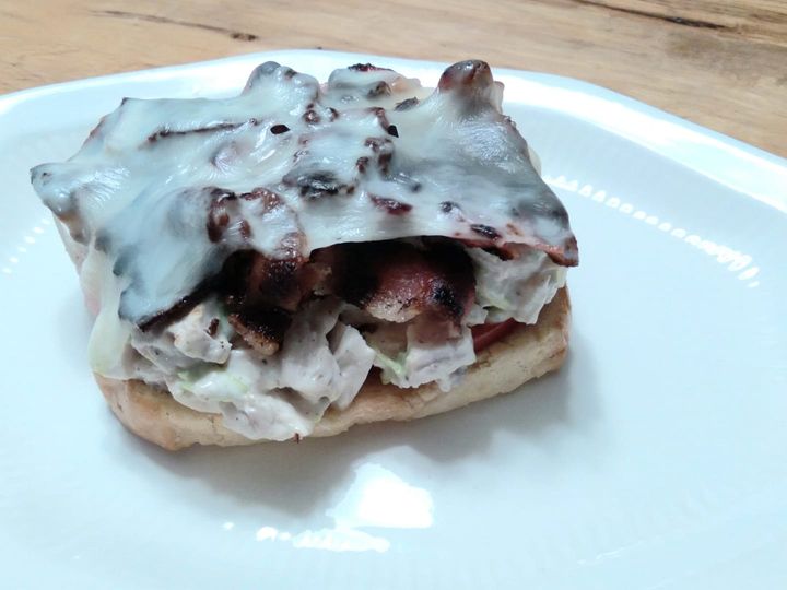 This is soo good. I usually put this on half of an everything bagel. I had some brioche so that is what we have. Toasted brioche, sliced heirloom tomato, homemade chicken salad, crispy bacon and cheddar cheese. I put it under the broiler just long enough for the cheese to melt.