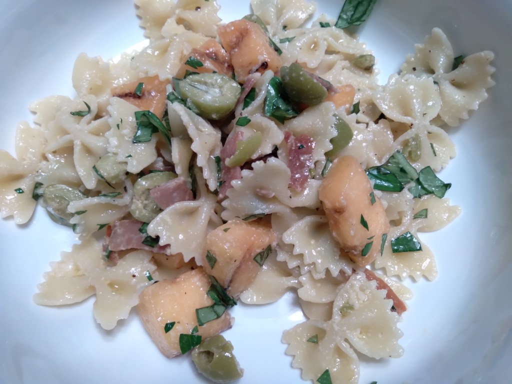 This is a great summer picnic dish. It hits all of the notes, sweet and smoky grilled cantaloupe, salty prosciutto and parmesan, briney olives and the bright fresh herbs. https://www.foodnetwork.com/recipes/giada-de-laurentiis/grilled-melon-and-prosciutto-pasta-salad-5291074