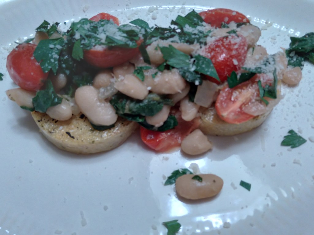 The grilled polenta has a nice char but, I would probably pan fry it next time to add a crispy texture. I wanted my tomatoes to be less cooked and more fresh so I added them at the end just to warm through. I added some fresh chopped spinach to the pan to wilt while the beans cooked. https://www.myrecipes.com/recipe/grilled-polenta-tomatoes