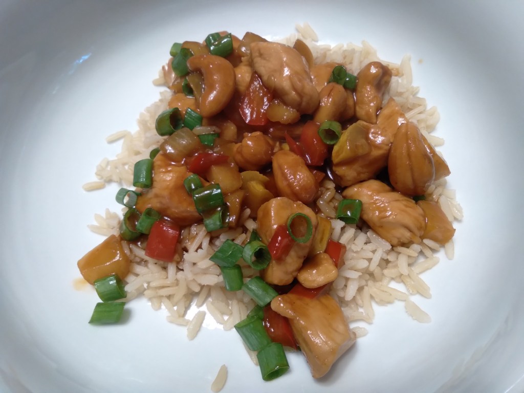 Heat your oil in a large skillet or wok. Add the soy sauce and ginger to the pan and heat for a few seconds. Cook the chicken pieces in batches cooking until mostly done and removing to a plate. When the chicken is finished add the onion and red pepper and cook until tender. Add the water chestnuts, hoisin and gochujang and combine then add the chicken to the pan. Simmer covered for about 10 minutes. Add the cashews and cook uncovered for 5 minures. Serve over rice and garish with the green onions.