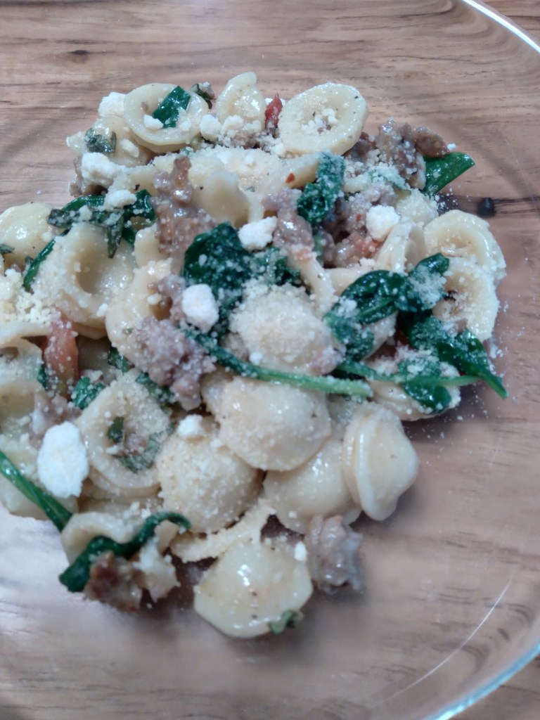 Start by putting the pasta on to boil. Brown your sausage and remove most of the fat, leave about 1 tablespoon. Add the spinach and stir until wilted then add the garlic and oregano and cook for about a minute. Reduce pan temperature to medium low. Drain your pasta reserving 1 cup of the pasta water. Toss the pasta into the pan with the sausage and spinach add the olive oil and 1/2 cup of the pasta water. Stir to combine. Season with salt and pepper.Add more pasta water if you need more moisture. Turn off the heat add the diced tomato and the basil and parmesan to taste