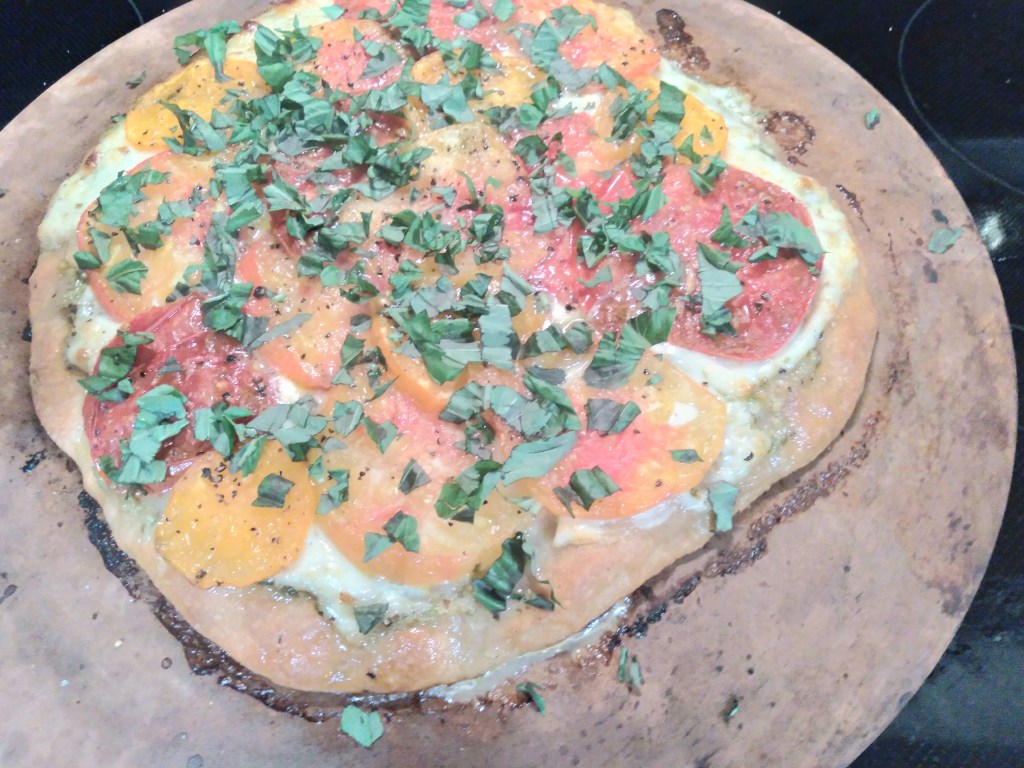 The flavor of this pizza was spot on. But the crust left something to be desired. I used a fresh pizza dough. I prebaked it a little. I should have baked it until the crust was crisp on the bottom. The tomatoes have so much moisture the crust couldn’t get crisp it was a little chewy.
