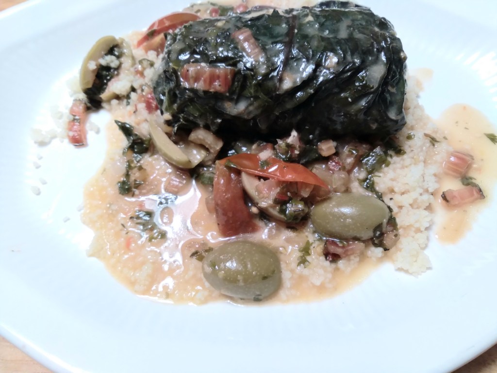 I make a meatball mixture using ground chicken, chopped onion, garlic, bread crumbs, salt and pepper, and a beaten egg. I use that as my filling for stuffed swiss chard. A nod to the cabbage roll. I usually bake these in the oven with tomato sauce. I wanted something different and I found this fish recipe. I did not add the tomatoes when the recipe calls for. The ground chicken takes longer to cook than fish. I cooked this covered for 10 minutes and turned it over and cooked it 5 more minutes added the tomatoes and cooked 5 more minutes. This was so really good. Lemony and rich. https://www.epicurious.com/recipes/food/views/chard-wrapped-fish-with-lemon-and-olive