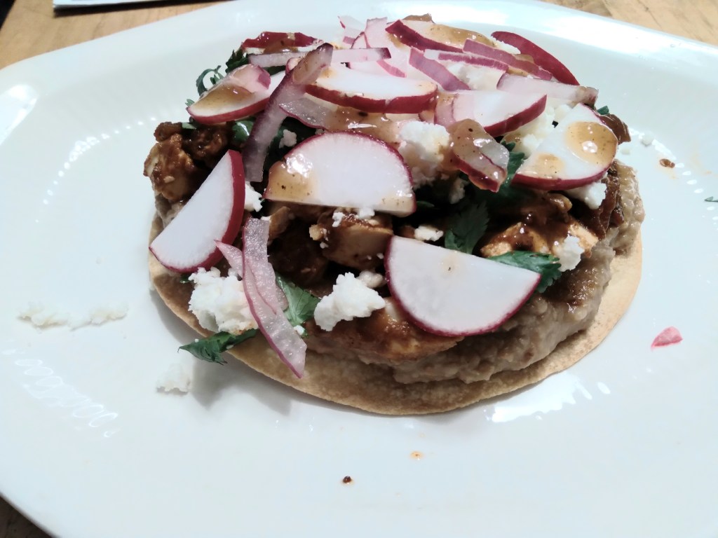Tostadas are a go to week night meal for me. They are so quick, easy and filling. I use flour tortillas. I dock them with a fork and spray them with cooking spray on both sides and bake them until crispy, turning them during the baking and poking any air pockets with a fork. I warm a can of refried beans for my base. I use a rotisserie chicken. I cube the chicken and put it in a non-stick skillet add your favorite taco sauce and bring to a simmer. I use Frontera brand. Top the tortilla with some beans, add the chicken and top with your favorite topping. Dinner in a flash.