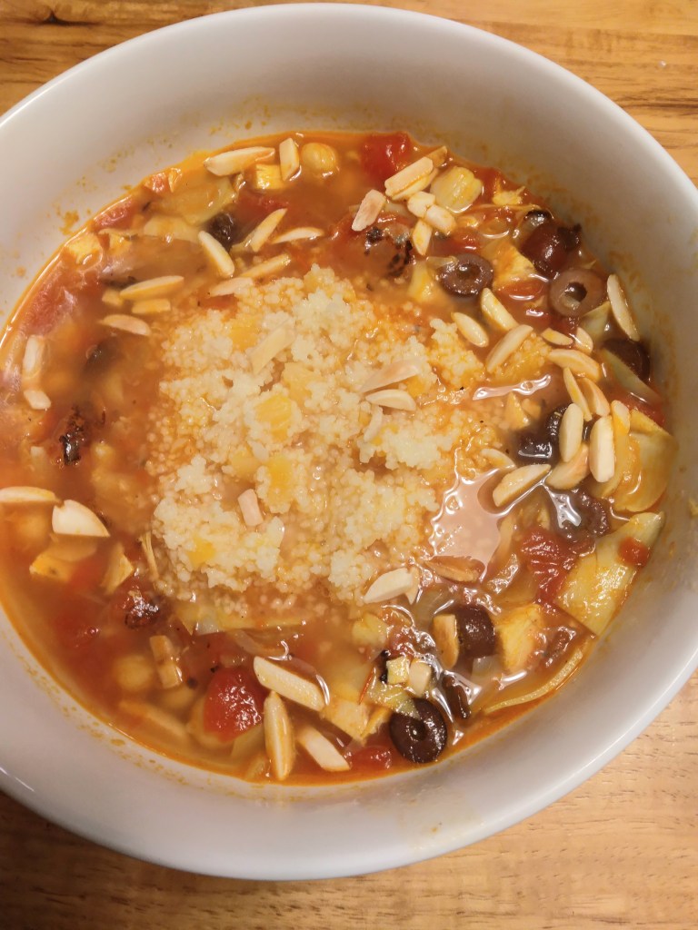 I love a tagine. The sweet dried fruit, briney olives and warm spices are so comforting. This soup has all of those notes and some. The creamy chickpeas and artichokes are a great touch.. The addition of the sweet floral citrus notes of the couscous make this a home run! https://www.cuisineathome.com/recipes/lunch-dinner/moroccan-chicken-soup/